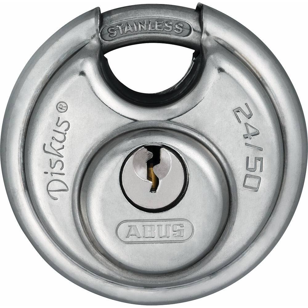 Durch die Form der Diskusschlösser werden die gebräuchlichsten Überwindungsmethoden wirksam verhindert. So bietet die konstruktionsbedingt kleine Bügelöffnung kaum Platz für Angriffe auf den Bügel. Durch die überwiegende Verwendung von Edelstahl findet das Diskusschloss seinen Einsatzbereich besonders da, wo Sicherheit und Korrosionsschutz gefordert werden. Mit dem ABUS Diskus 24IB lassen sich LKW, Türen, Tore, Scheunen, Keller, Schuppen usw. verschließen. Idealerweise sollte dabei eine ABUS Diskus-Überfalle verwendet werden, damit der Bügel des Schlosses nicht mit Aufbruchwerkzeugen angegriffen werden kann.