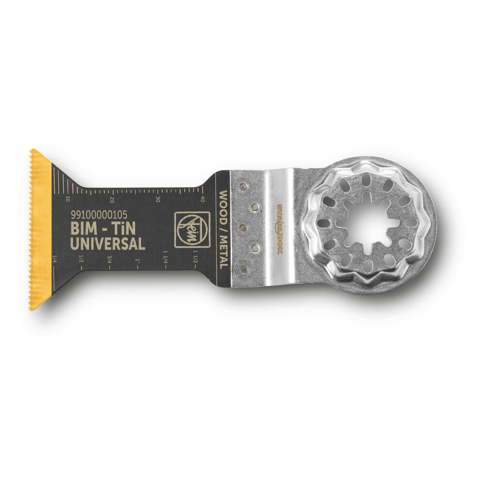 Titan beschichtetes Bi-Metall Sägeblatt mit 4x höherer Lebensdauer als HCS-Sägeblätter. Starlock-Aufnahme für präzise Schnitte in Blech bis 2 mm, Aluminiumprofilen, Kupferrohren, Holz, Gipskarton und Kunststoffen.|Sägeblatt mit gewellter Verzahnung für universellen Einsatz.|Äußerst robust, unempfindlich auch gegen im Holz befindliche Nägel (bis ca. Ø 4 mm) und leichtem Mauerwerk.
