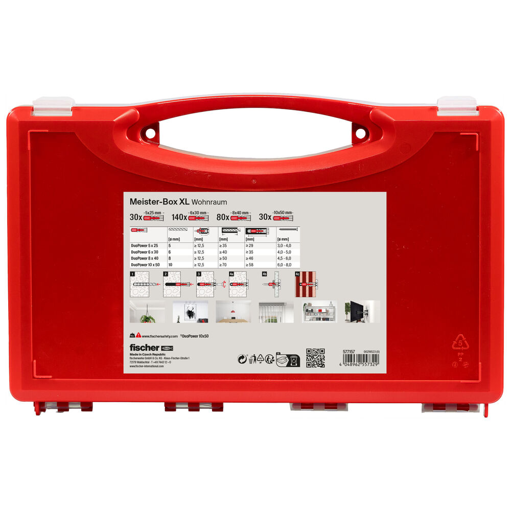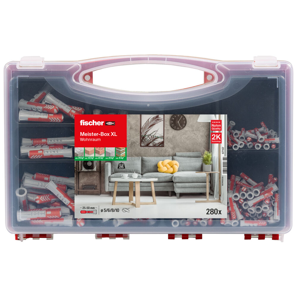 Diese fischer Meister-Box bietet eine praktische und übersichtliche Aufbewahrungslösung als Dübelset für Werkstatt und Baustelle. Der hochwertige, schlagfeste Kunststoffbehälter mit transparentem Deckel ermöglicht jederzeit einen klaren Blick auf den Inhalt. Die vorsortierte 280-teilige Box enthält 30 x DuoPower 5 x 25, 140 x DuoPower 6 x 30, 80 x DuoPower 8 x 40 und 30 x DuoPower 10 x 50 – optimal für die Befestigung im Wohnraum.