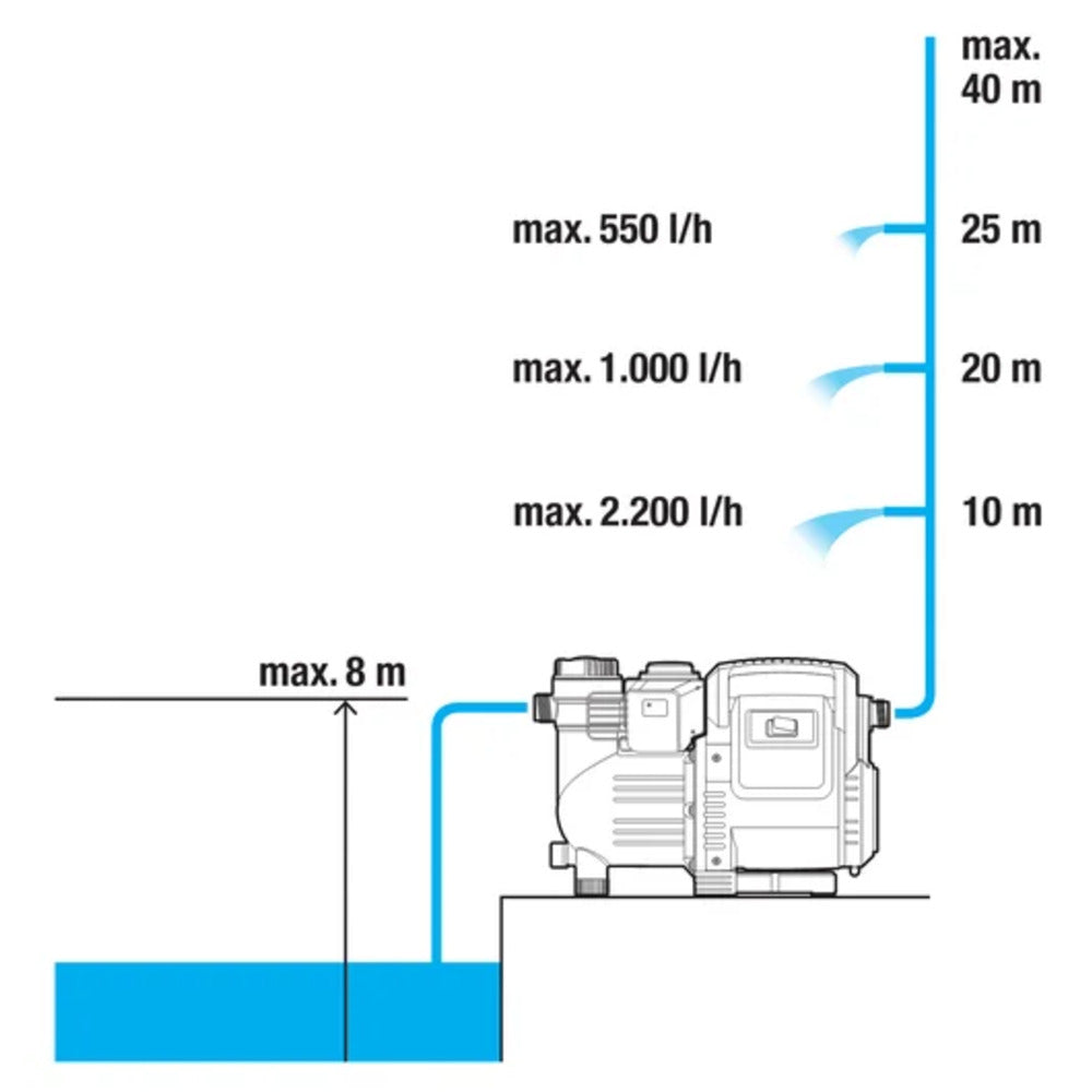 Mit elektronischen Druckpumpen wie dem kompakten Haus- und Gartenautomaten 3500/4 von GARDENA sparst Du Geld und schonst die Umwelt. Nutze Regen- oder Brunnenwasser zur Bewässerung Deines Gartens oder verwende es für Toiletten oder die Waschmaschine im Haushalt. Die integrierte Elektronik schaltet diese robuste Druckpumpe automatisch ein, wenn Wasser benötigt wird, und nach Gebrauch wieder aus. Die effiziente Pumpe mit einer Leistung von 800 W, einer maximalen Förderleistung von 3500 l/h und einem maximalen Druck von 4,0 bar ist sowohl für den stationären als auch den mobilen Einsatz ideal geeignet. Die aus hochwertigen Materialien gefertigte und in Deutschland entwickelte Automatikpumpe für Haus und Garten verfügt über eine Edelstahlwelle sowie ein doppeltes Keramik-Dichtungssystem zwischen Motor und Hydraulikbereich. Die Bedienung ist störungsfrei und komfortabel. Dank des ergonomischen Tragegriffs kannst Du den Haus- & Gartenautomaten leicht transportieren. Die Pumpe wird per Knopfdruck in Betrieb genommen, um die zahlreichen Funktionen mit einfacher Bedienung zu nutzen. Das integrierte Rückschlagventil ermöglicht ein schnelles Ansaugen. Besonders praktisch ist das innovative Kleinmengenprogramm, das eine problemlose Anwendung bei kleinen Fördermengen, wie bei modernen Waschmaschinen oder Tropfbewässerungsanlagen, störungssicher erlaubt. Die automatische Pumpe verfügt über ein Fehlerdiagnosesystem: Störungen, z.B. durch tropfende Wasserhähne, undichte Toiletten-Spülkästen oder saugseitige Probleme werden über eine LED, die je nach Pumpenzustand in unterschiedlichen Frequenzen blinkt, deutlich angezeigt. So lassen sich mögliche Pumpenprobleme einfach erkennen und schnell beheben. Die Trockenlaufsicherung verhindert eine Beschädigung der Pumpe bei fehlendem Wasserdurchfluss. Wie alle GARDENA Produkte ist die Pumpe aus hochwertigen Materialien gefertigt. Sie ist für einen leistungsstarken sowie geräuscharmen Betrieb ausgelegt. Ein wartungsfreier Kondensatormotor mit thermischem Überlastschalter transportiert das Wasser über ein saugstarkes Jet-System effizient an die gewünschte Stelle. Eine große Öffnung zum Befüllen der Pumpe vor dem Einsatz trägt zur leichten Handhabung der Pumpe bei. Gummifüße sorgen für einen sicheren Stand sowie einen geräusch- und vibrationsarmen Betrieb des Gerätes. Zum Schutz vor Schmutz und Sand ist an der elektronischen Druckpumpe ein großvolumiger Feinfilter installiert. Dadurch ist kein externer Vorfilter erforderlich. Diese robuste Pumpe eignet sich ideal für die Gartenbewässerung, denn sie kann dank des wetterfesten Gehäuses die ganze Saison über unbeschadet draußen bleiben. Bei Frostgefahr entleerst Du den Haus- & Gartenautomaten 3500/4 über die Wasserablassschraube. GARDENA ist bekannt für hochwertige Produkte und erstklassige Verarbeitung.