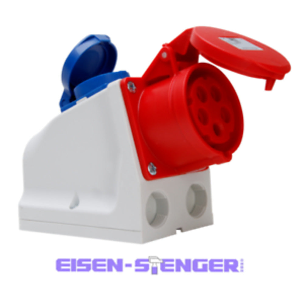 CEE-Kombi-Wandsteckdose, CEE-Steckdose, Schutzkontakt-Steckdose mit Klappdeckel, 16A, 250V~, 5-polig, 16A, 400V~, 6h (inkl. 3 Klemmblöcken), Schutzart IP44, Farbe: grau-rot-blau