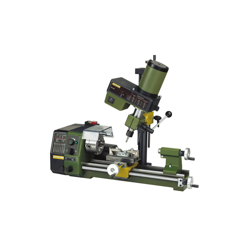 Inklusive Säule (35 x 400 mm), Anbauflansch und Befestigungsschrauben (plangefräste Fläche ist an der PD 250/E und PD 400 vorhanden). An Stelle des Stahlhalters wird ein dazu gehörender Nutentisch (110 x 70 mm, mit drei T-Nuten 12 x 6 x 5 mm) auf dem Oberschlitten fixiert. Die Drehmaschine ersetzt nun den Koordinatentisch (Verstellung über Längsvorschub und Querschlitten). Der Bohrkopf ist identisch mit dem der Feinfräse FF 230. Inkl. drei Spannzangen (6, 8 und 10 mm).