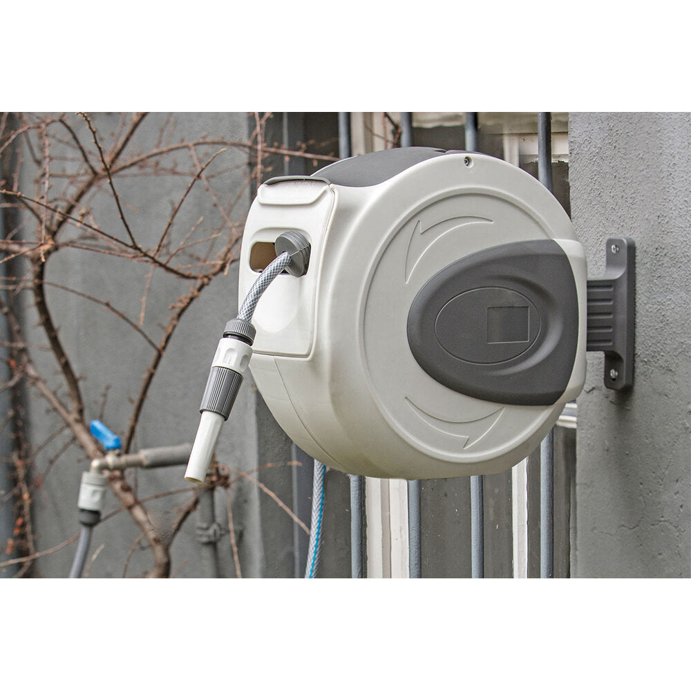 - Kein mühsames Aufwickeln des Wasserschlauches mehr notwendig. Ein leichter Zug am Schlauch genügt und die Aufrollautomatik verstaut den gesamten Schlauch im Gehäuse des Aufrollers.